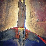 Op ruw canvas zien we een horizon, een nieuw landschap, een rietkraag, een nieuw begin.