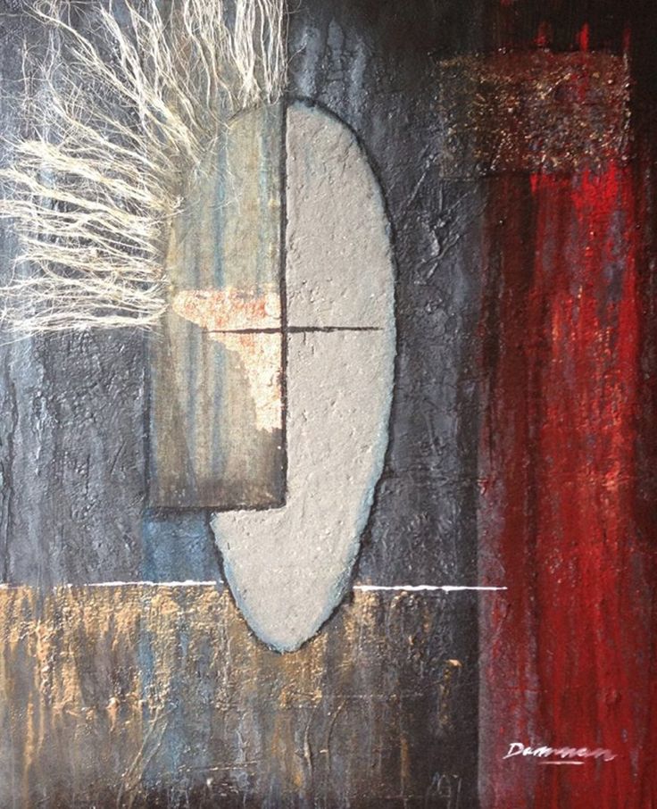 Acryl, Zand, rafia,ruw canvas en bladmetaal op doek. Geïnspireerd door de behoefte van de mens om vorm te geven aan dat waar we in willen geloven.